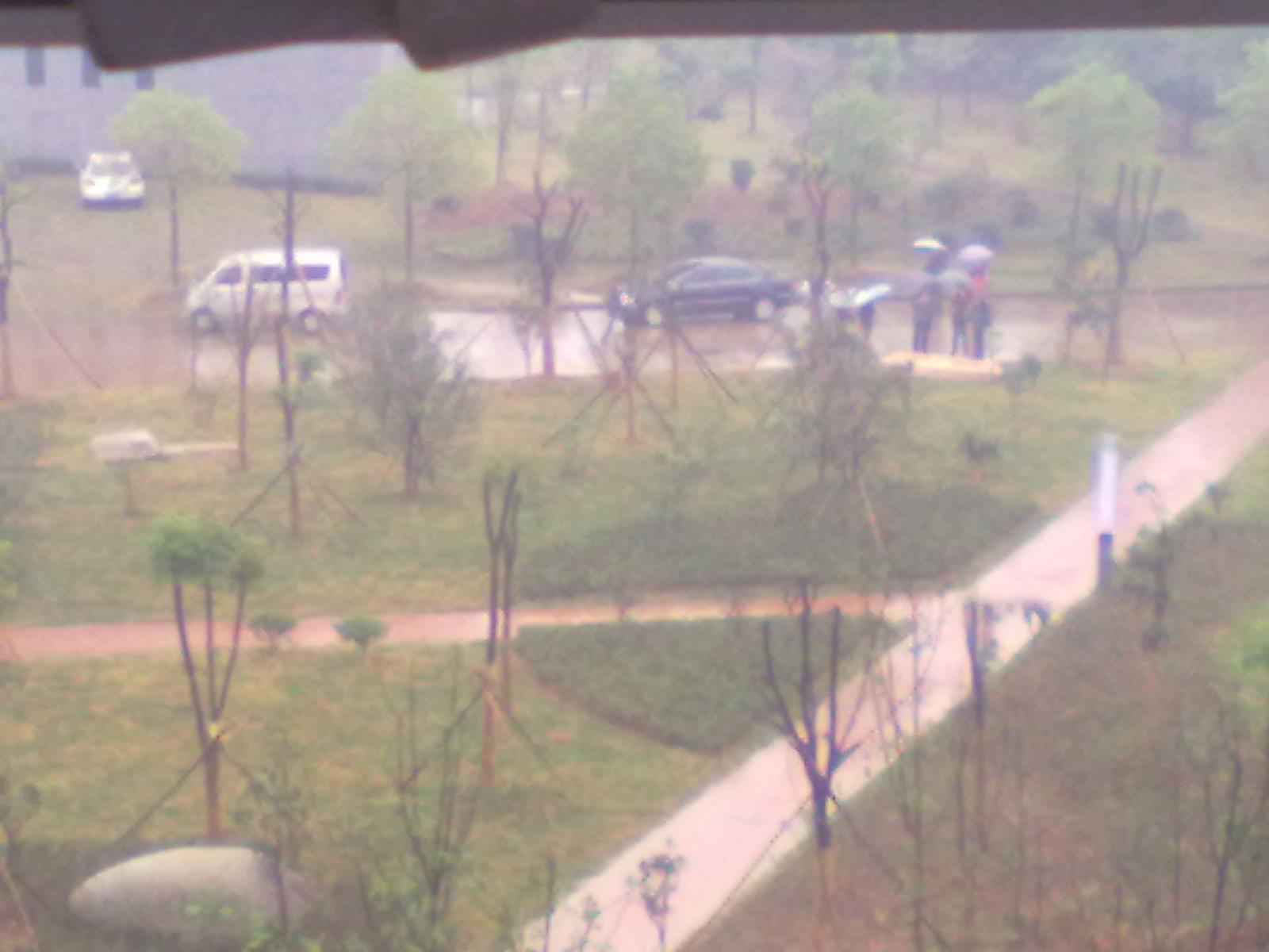 我校领导雨天视察校园树苗长势情况