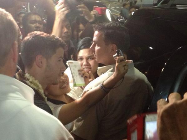 fans离真正的旅客出口大概150米远,很多好心保安在不远处替我们望风,他们说出来了人们就开始尖叫,其实只能看到一群记者的人头把三只包的水泄不通。他们走出记者的包围圈就直接进车里了,先后走了五辆车,只有第三辆的一扇窗玻璃是打开的,Kevin从里面向Fans招手,笑得很灿烂(别问我是什么样的,跟照片里一个样,喜庆),但是那个车速真的很快很快,很多想拍照的人还没来得及按快门车就飞过去了,录像的也同样郁闷lol 这时候很多女生都踩上栏杆了,就差扑出去- -记者在出口拍完他们上车就都跑过来拍我们,我明天不是要上电视就是要上网站新闻了