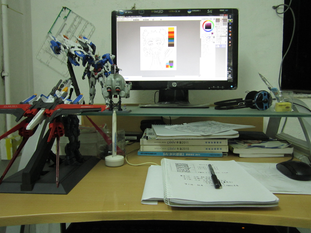 右边:教材X5,高达模型书一本,拍子本X5(人物设定+剧情构思)