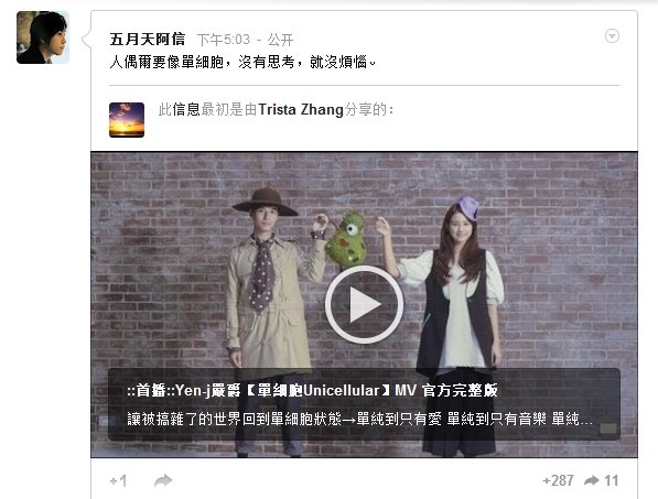 (分享的是严爵的新歌单细胞MV,就先不发链接出来了……如果有人要的话我再发出来……)