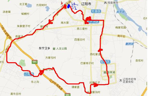 起点:辽纺棚户区。沿胜利路向南骑行,经过蔡庄来到首山——沿人民街过县政府——经过岔道左拐到新立屯——沿直道来到兰家——丁字路口右拐——沿直道来到辽阳南站高速口——左拐来到宏伟区东喻村——前方路口右拐爬过上坡来到辽化医院——沿健康路大坡一路滑行至辽化高中——一路北上回到市里——沿17路路线来到一高中——右拐至四处沿新兴街经南庄——新家族直至到家(辽纺棚户区)