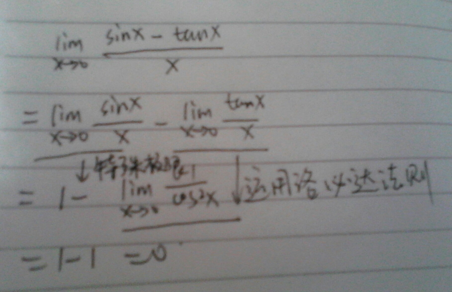 错在当X→0时,分子分母都为0不能用等价代换,可以用特殊极限和洛必达法则进行计算