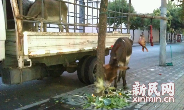 上海一餐馆当街杀驴 驴头挂树上吓哭小学生