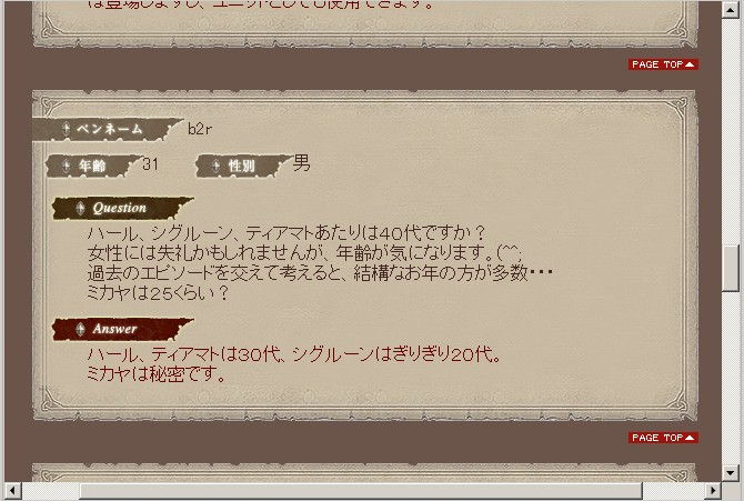 我也不懂日语..请问他说的是不是,哈尔、迪亚玛特30多岁,希格伦20多岁,米卡娅的年龄是秘密?还真是欠扁的回答..