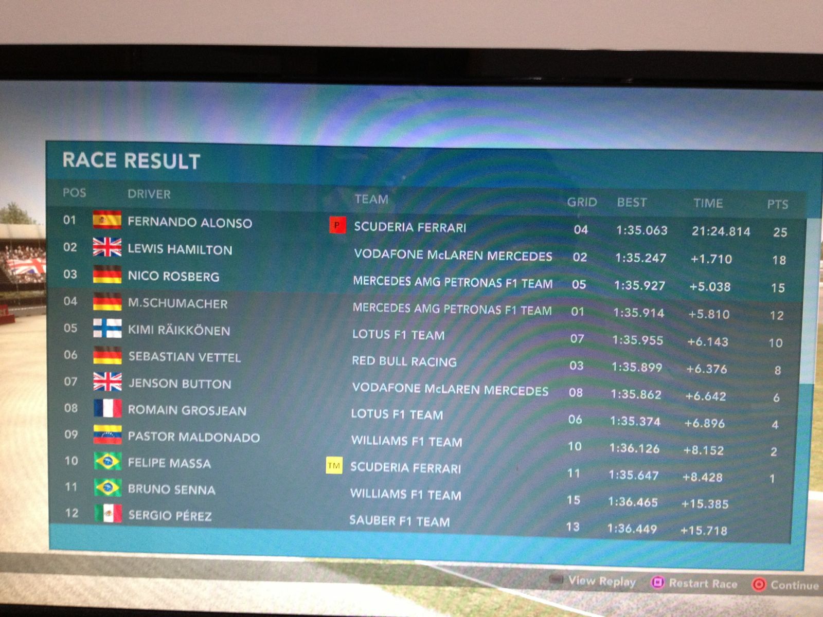优酷上看到一个人阿布扎比跑了1:42,是计时赛模式,我又忍不住了,请叫我忍不住君……用法拉利跑了几圈1:41.7,结果游戏无响应了,用红牛跑了一圈,仅仅一圈,1:41.5了,多跑几圈还能快,有好几个地方没走好线,明天或后天传优酷视频,届时送出视频链接,先看截图吧