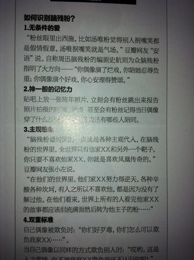 美国塔尔萨大学传播学教授朱莉·詹森提出了粉丝的两种病态类型——着魔的独狼和歇斯底里的群众。这其中,后者有点类似于我们经常看到的“脑残粉”这—概念。“脑残”,在词义上近似于“非理性”。