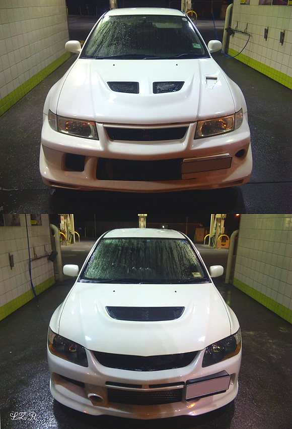 白色改装是E7,前方LOGO下方2个小进气格栅,以及车顶充分说明了是E7,经过位图放大,并未发现白色改装车车顶上方有2条类似于加强钢精条的曲线。