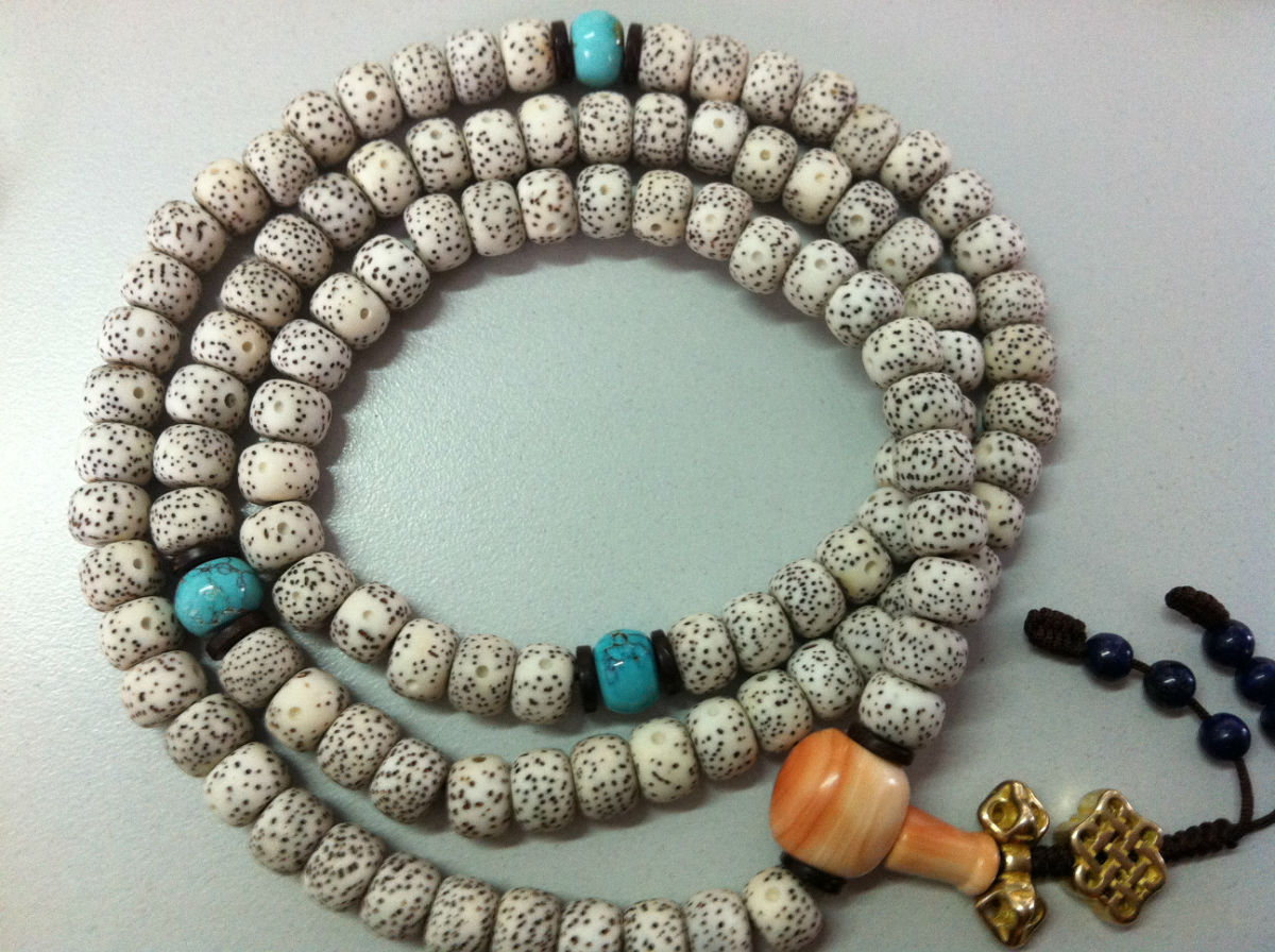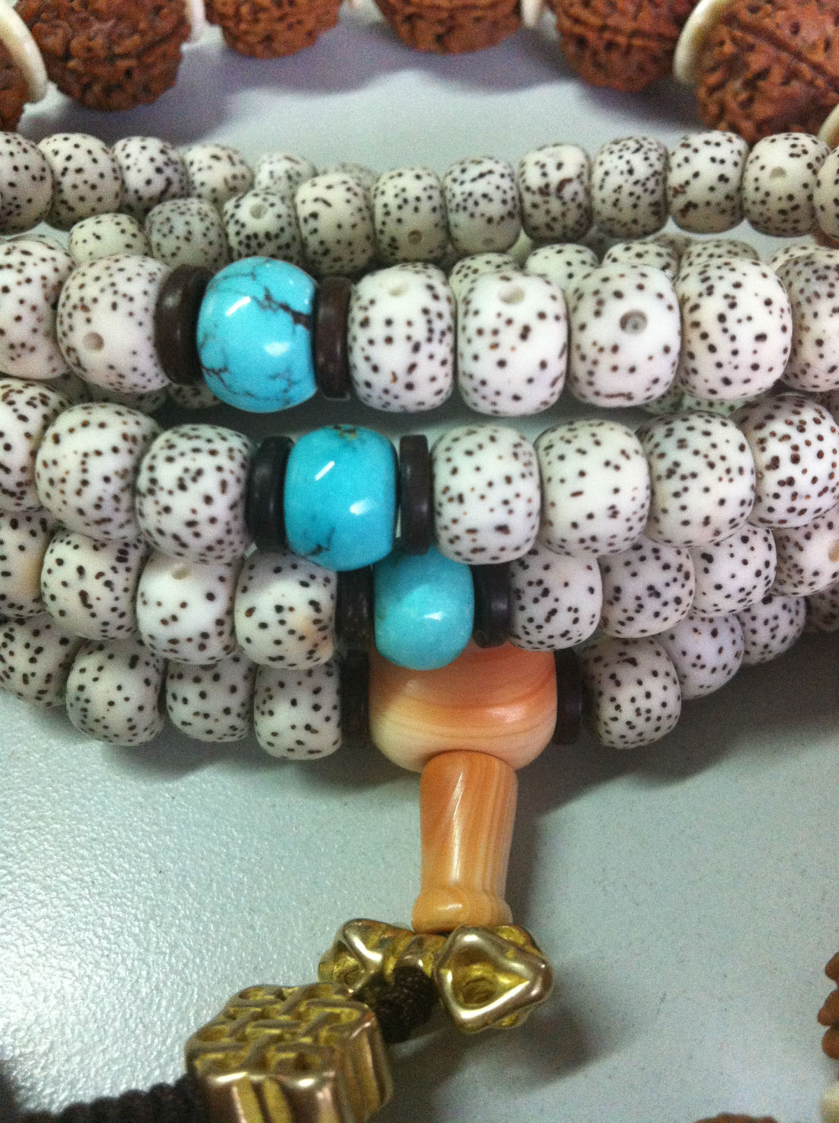 新手,某宝新入一串星月9*7,颗颗正月,三个天然松石,血砗磲佛头,青金石小珠子,求前辈鉴定,能盘不?