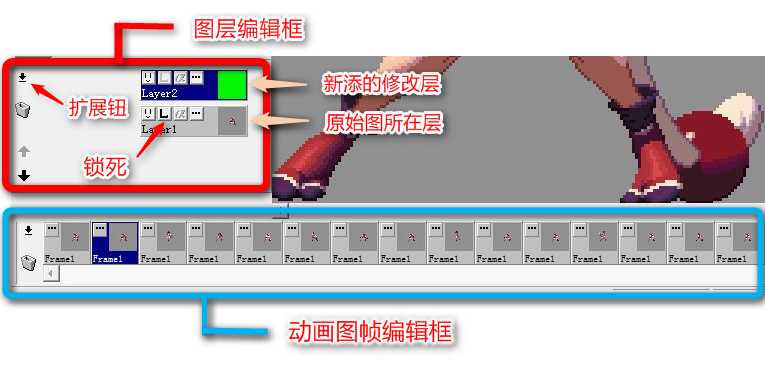 如上图,选择一帧图,单击“层编辑框”的扩展按钮,点击“添加”即可。 增加修改层时,勾选“透明色”项。