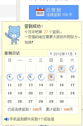 时间过得好快啊,不知不觉中,已经连续签到100天了!一点也没觉得有那么长的时间啊!呵呵呵,有和我一样,连续不断的签到的么?