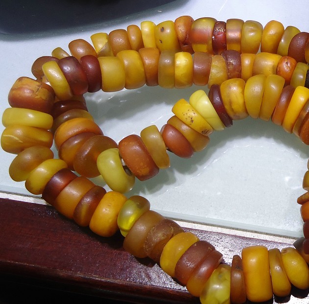 其实是蜜蜡还是贸易珠一上手便知,老蜜轻搓就有香味,图看大部分应该是老蜜,只是没保养好,泡泡油就好了呵呵