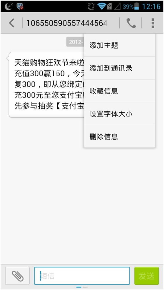 在单条短信界面,点击菜单键,在下拉菜单中选择收藏信息。