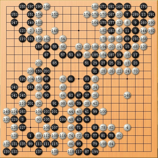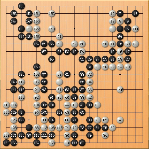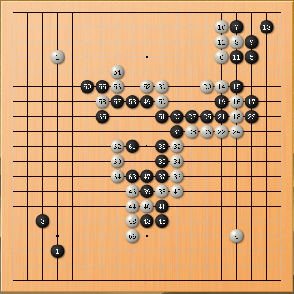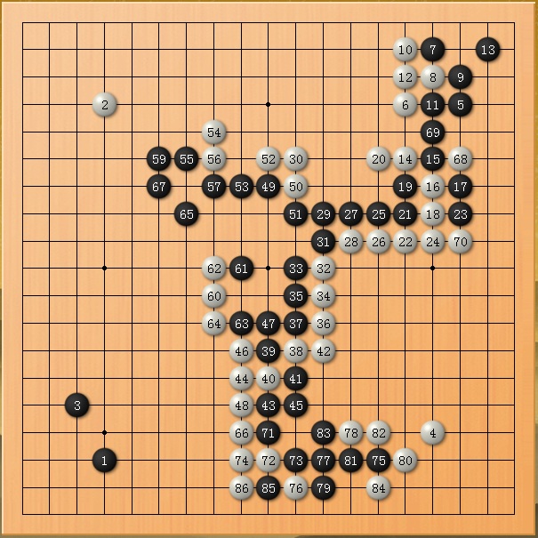 此局一开始只想老老实实占点实地,没想有大作为。众所周知,银星12的四段喜欢死缠,对着扳是它的专爱。扳来扳去终于把我扳烦了,给它来个断!结果发现,如果我被断掉的部分能做活的话,很有希望杀掉它中腹的长龙!于是我不要实地了,连右上角也扔了,专心想法杀长龙!结果没有失望,刚刚好实现了这个意图,而且意外的还收了左上角。结果,收官时已经是破纪录地胜了它61目!