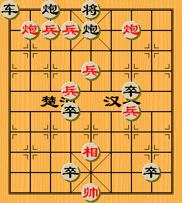 第2局最初是这样排的,如下图,红方没有六路高兵,后来发现太复杂了,而且好象红先黑胜.喜残局的有闲暇的吧友可帮忙验证一下,个人残棋水平有限.
