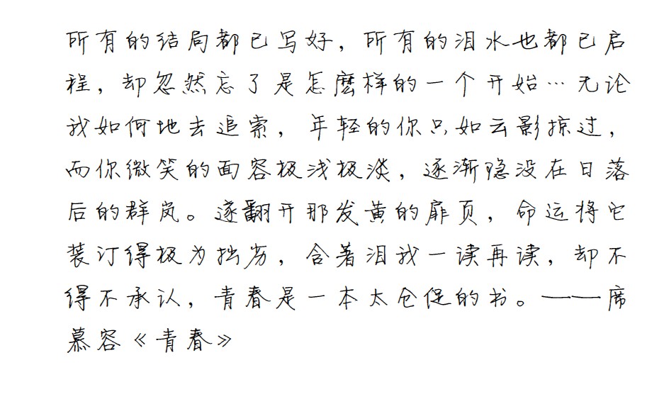 : 所有的结局都已写好,所有的泪水也都已启程,却忽然忘了是怎麽样的一个开始…无论我如何地去追索,年轻的你只如云影掠过,而你微笑的面容极浅极淡,逐渐隐没在日落后的群岚。遂翻开那发黄的扉页,命运将它装订得极为拙劣,含著泪我一读再读,却不得不承认,青春是一本太仓促的书。——席慕容《青春》