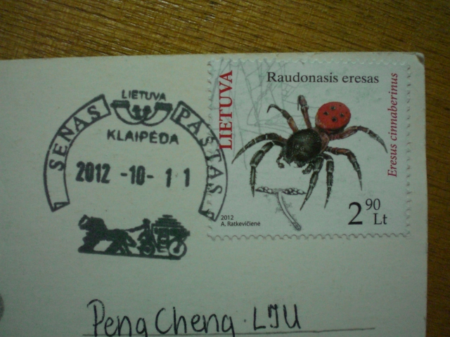哇塞 明信片和邮戳都很特别啊 表示我有一立陶宛笔友也是KLAIPEDA的 前段时间给我寄信也用这邮票 字也有点像 难不成是同一人吧
