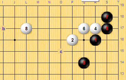 由于黑7都伸到2路了,白围地已经不大。黑b位白就跳补一个。只要能安定或不被攻击到就行了。跳补是为了把棋走向中央。上面再围的话,一般已经没有那个心情了。
