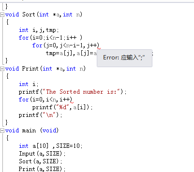 第二个for要加花括号,另外,tmp=a[j]和a[j]=a[]之间应该用分号隔开,不是逗号