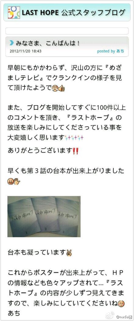 【last hopeのblog】staffblog更新 有lasthope的剧本照哟