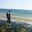 他独自在孤岛上,无路可走。有一天,他正坐在海边哀叹,突然看见海面上远远出现一只小船,这使他希望顿生,他心情惶惑地等待小船驶近。