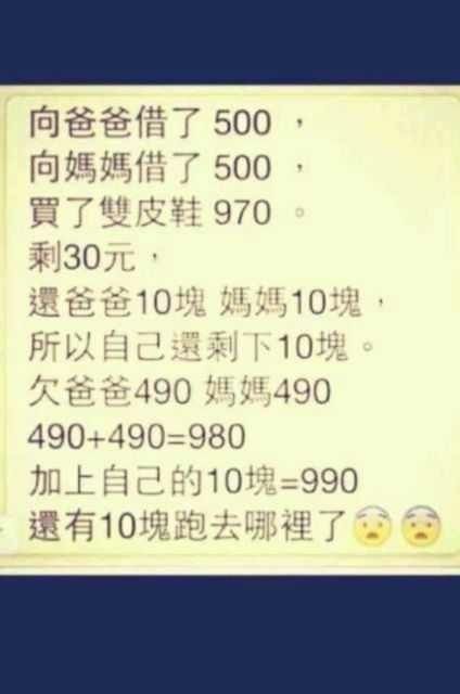 这个也是会计做假账的一种手段。 970块是皮鞋的价格,意味着欠爸爸和妈妈每个人485块,在每人还他们10块,除了皮鞋的价格之外,自己就只欠5块了。 所以应该是欠爸爸495块,欠妈妈495块。自己剩下10块。就是1000了。。