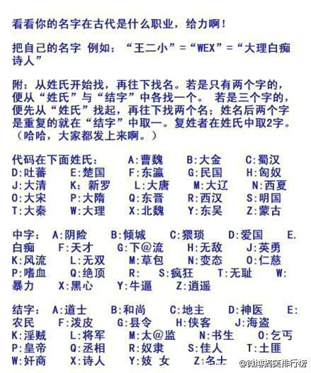 看看你名字在古代什么职业,给力啊。然后再说出来吧……