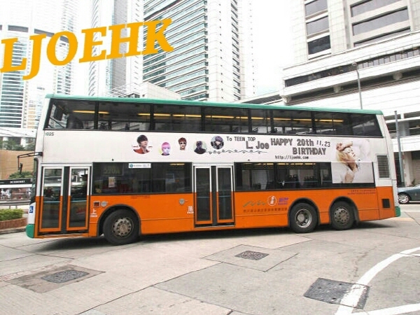 在海外拥有人气的TEEN TOP的L.Joe今年到20岁了。这是香港粉丝把TEEN TOP成员名字和英文名字刊登在二层巴士的照片。这是香港粉丝为本月23日生日的L.Joe而做的特别event。