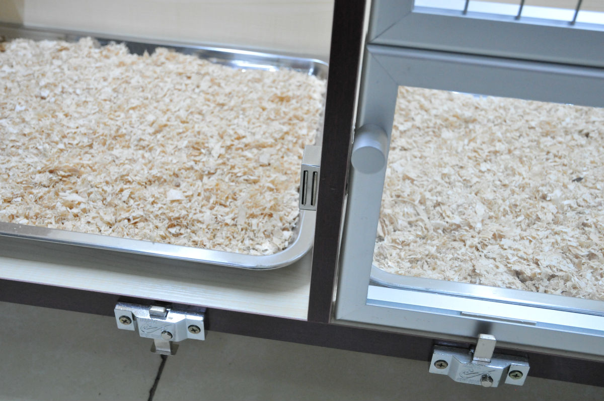 上下门,这个设计很普遍了,我也是为了打扫方便,这次改成这种,不用多说。但是板材上下两层我为了防止他们越狱,都换成2.5厚的板子,只为方便每个门多加一个弹簧插销,避免逃跑带来的不幸。