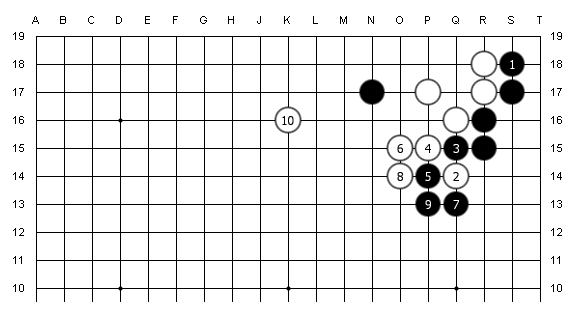 初学者在下棋过程中,如果黑9改下在a位(S18),那白棋该下哪里好~~另外,黑9是有什么目的的,或者说走黑9是不是还有有准备的下一手呢~~~ @