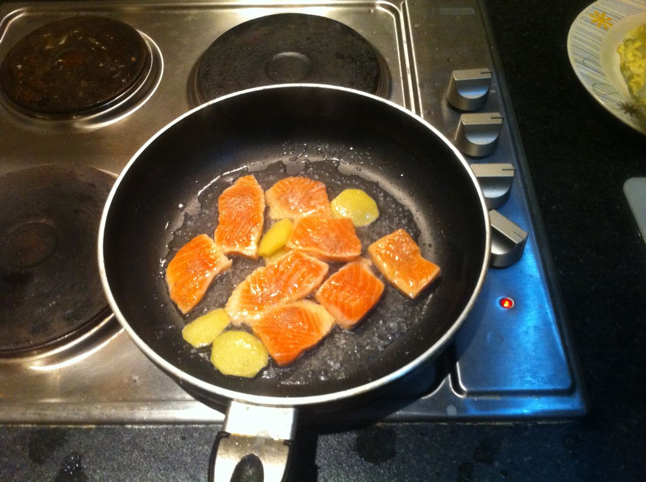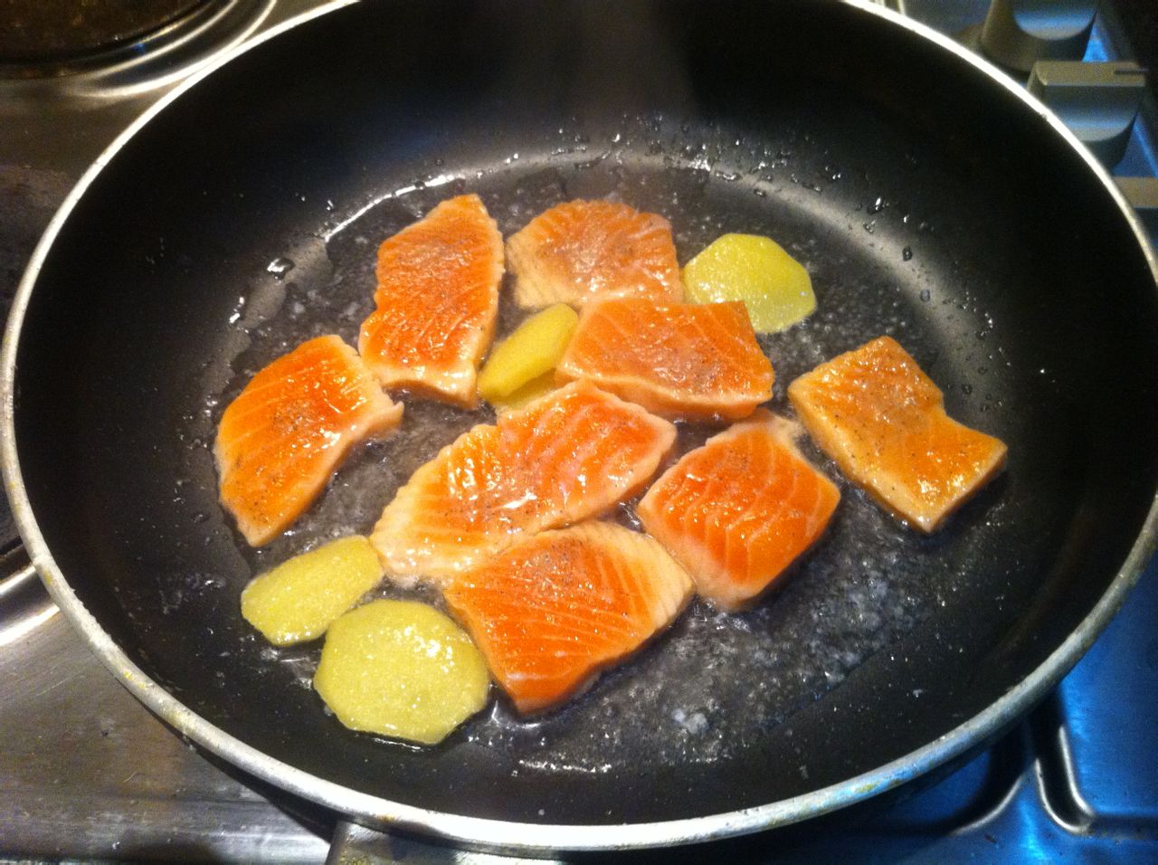 用盐和胡椒腌制好的三文鱼和姜片煎一下就好了。