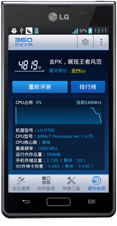 今天恢复出厂设置,然后下360优化大师跑了4670了,兴奋啊