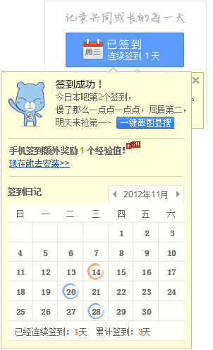 连续在本吧签到1天,晒下签到排名照,看看我神马水平