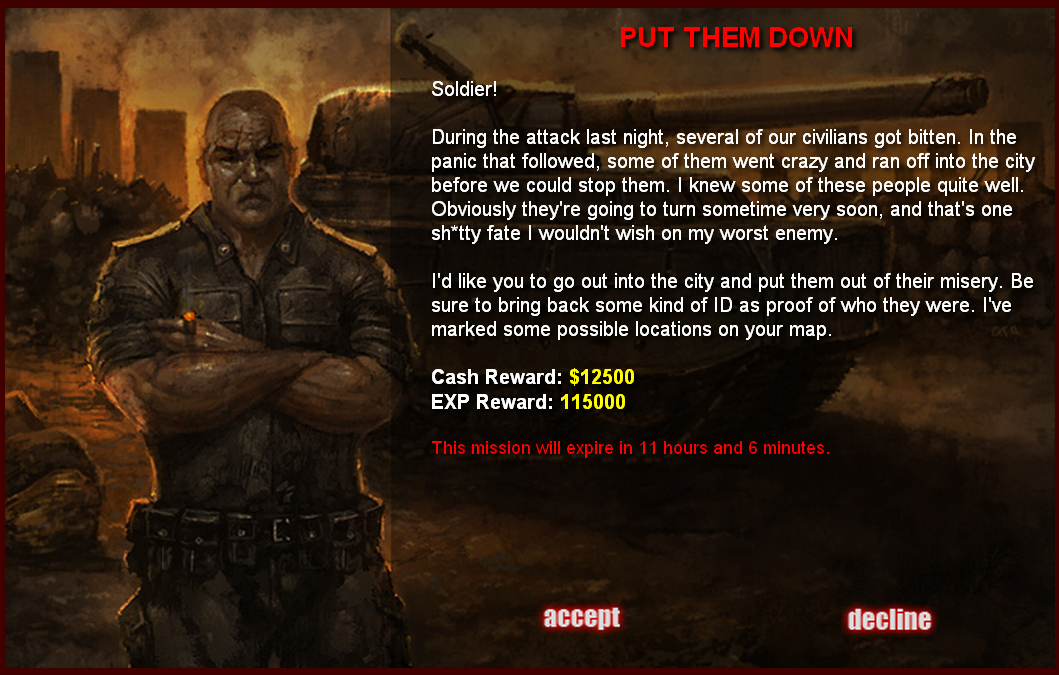During the attack last night, several of our civilians got bitten. In the panic that followed, some of them went crazy and ran off into the city before we could stop them. I knew some of these people quite well. Obviously they're going to turn sometime very soon, and that's one sh*tty fate I wouldn't wish on my worst enemy.