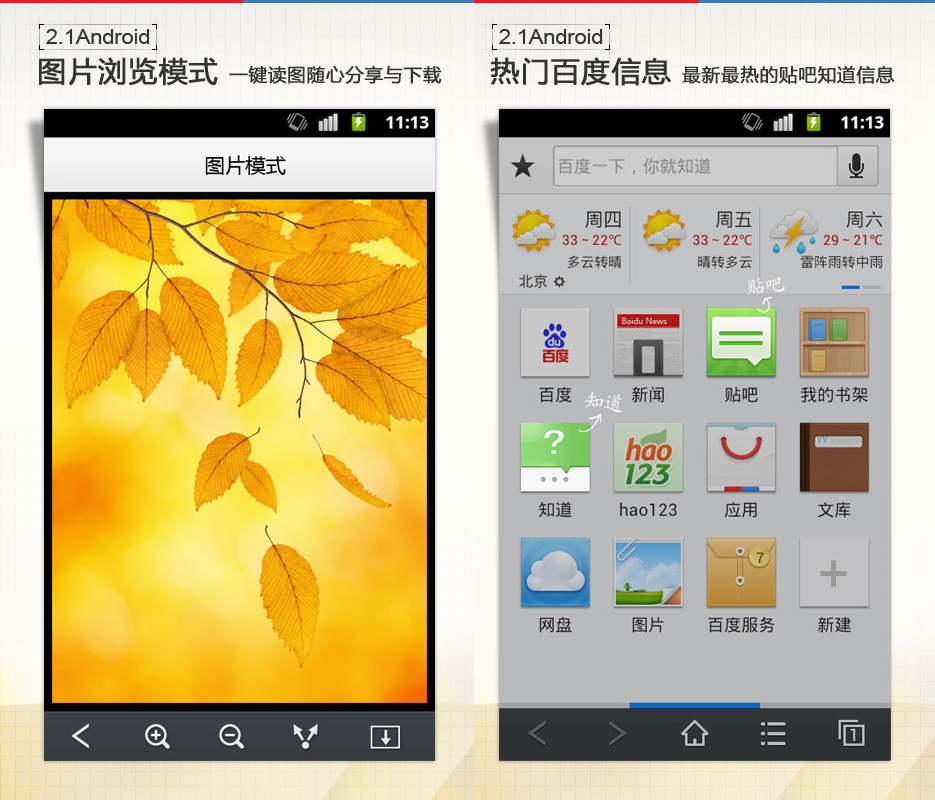 掌上百度2.1 android版本优化版发布,三重大礼回馈用户:第一重礼,更贴心的百度服务,知道回复提醒,身边美食资讯,贴吧热门看点尽在掌握;第二重礼,超便捷的页面浏览,一键尽览网页美图,分享下载随心而动,网页浏览加速,尽享热门百度资讯。第三重礼,老版贴吧小说书签全找回,全面支持老版中的贴吧小说书签,精彩回忆即刻找回。赶快来升级吧!