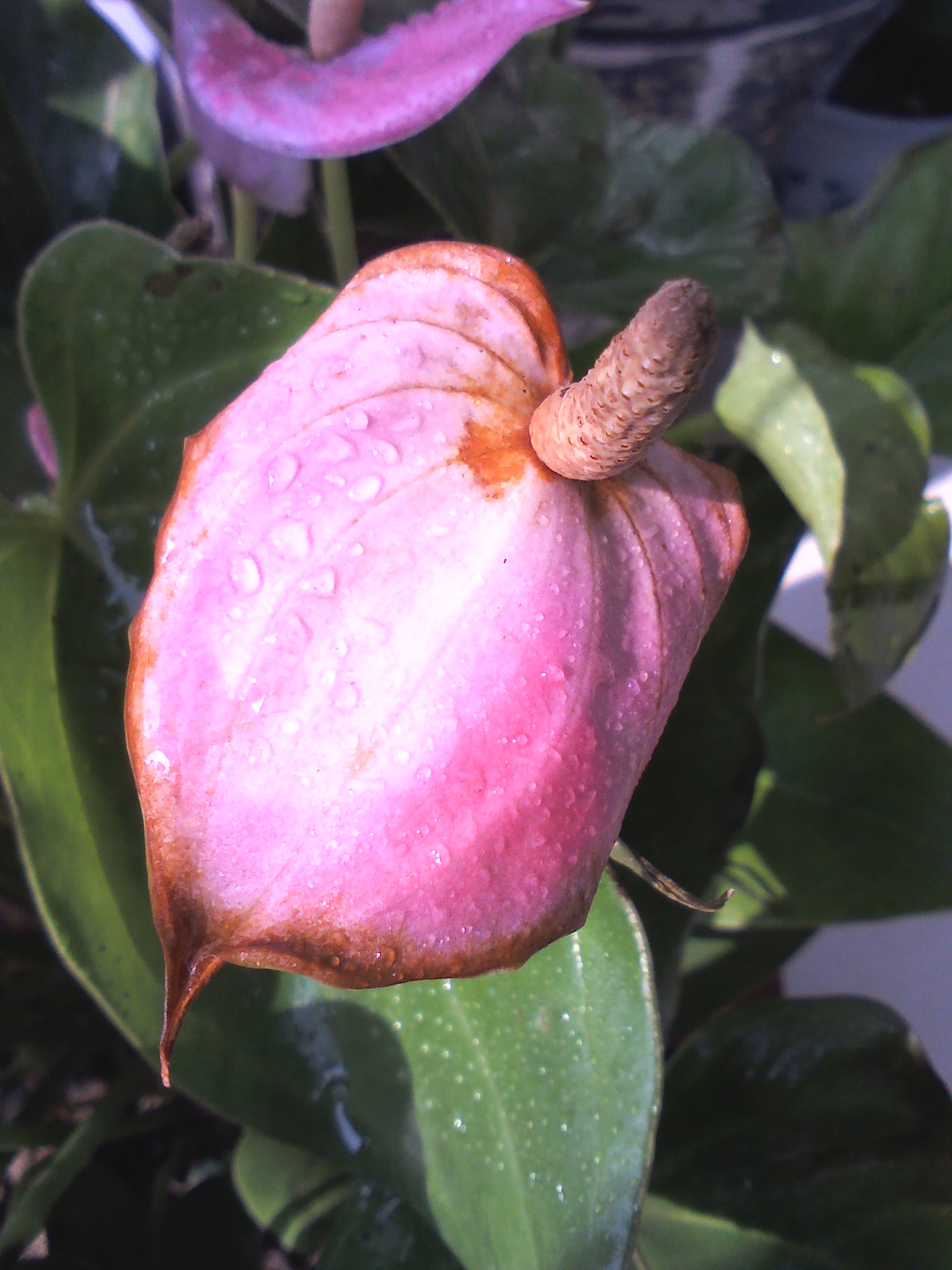 红掌喜欢温暖湿润的环境,喜大肥大水,平时可多向叶面喷水,但是花朵上不能喷水