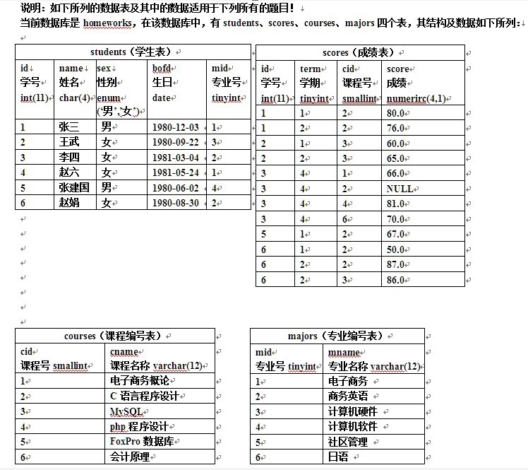 1. 写出创建数据库homeworks以及scores表的语句,定义主键以及列的注释。2. 写出制作数据库homeworks的备份文件homeworks.sql的DOS命令。