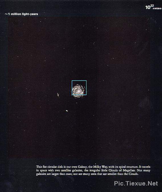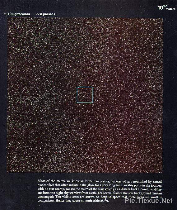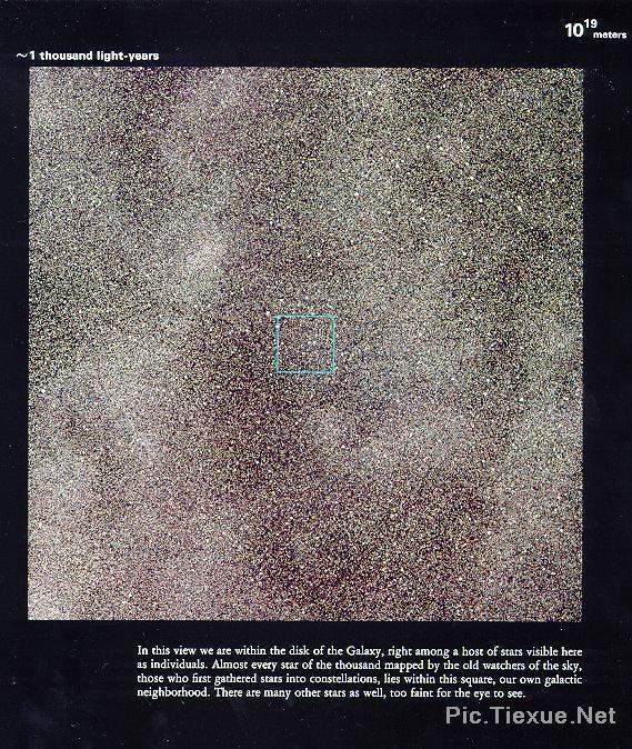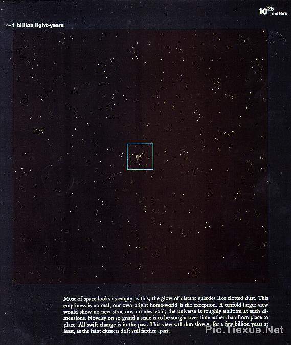 当我们看到十亿光年以外的星星时,映入我们眼帘的那束星光已经在茫茫宇宙间飞奔了十亿年。换句话说,我们现在看到的仅仅是它十亿年之前的样子!现在的它究竟如何我们只有再等待十亿年才能看到…… 下面这张图是在十亿光年这样的数量级下观测宇宙,上面的每一个象素点所表现的事物都是无比古远的。宇宙的无穷无尽,停留在纸上,今天,让我们用自己的眼睛来体验!