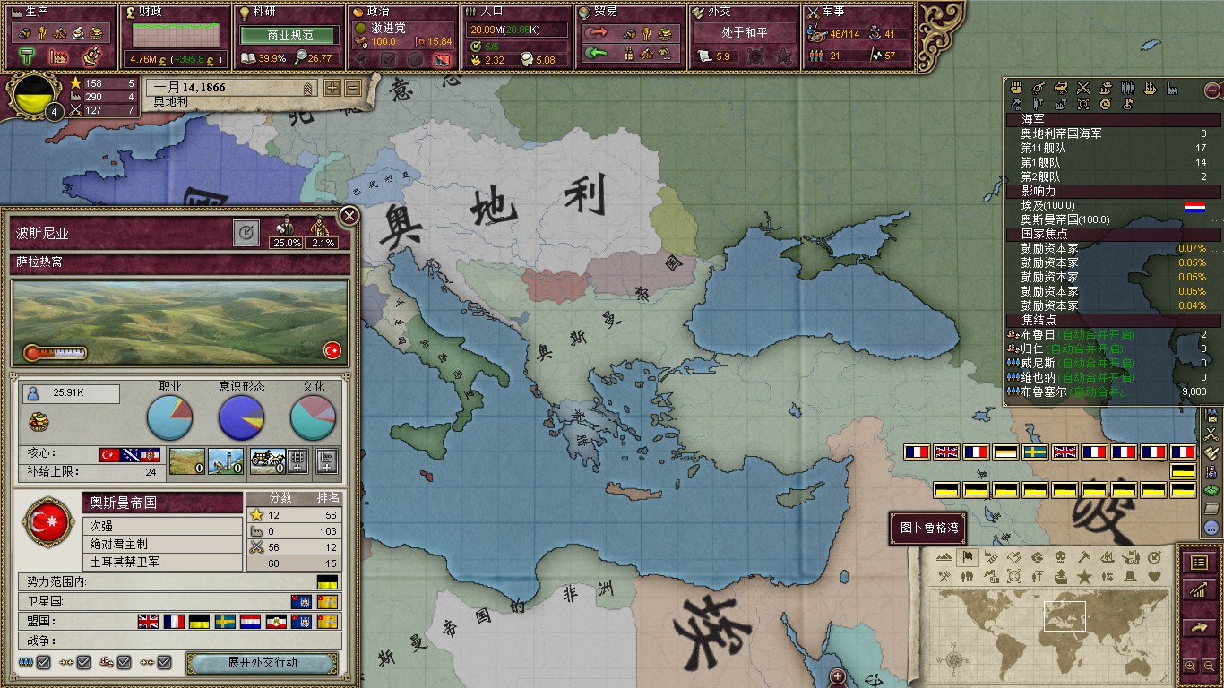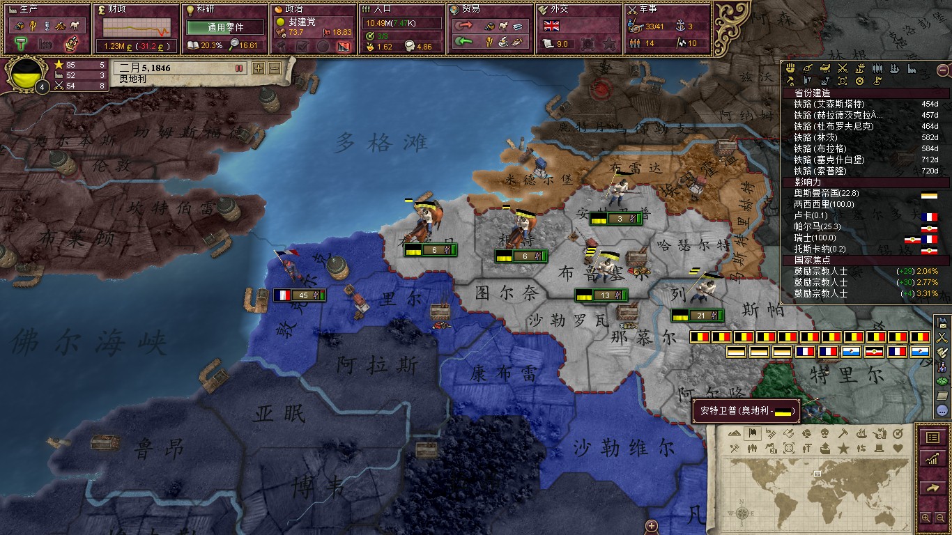 一晃好多年就挂过去了,被发现征服比利时的恶名还是很高的。但是有好处就是增加了我国的觉醒度,工厂全部修好后,也就是至少保证每一个地区有一个工厂就不要收关税了,奥地利的自由党竟然是干涉主义加完整公民权,决定就是你了!!