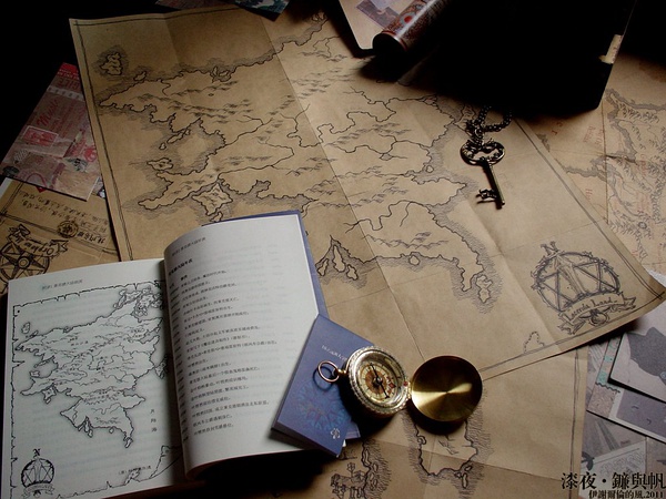 我大概从02年起就在画莱克德大陆地图了,因为一直都是手绘再手绘,所以每次画出来的都有出入——有刻意的改动,也有无意的不同。而这张大概能称为“完成品”的图是05年写《永夜格泽》的时候画的,边框与左下角那个剑与魔法阵的图案也是手绘,之后扫描到了电脑里,就再没有轮廓上的变动——而我的年表至今仍在经常变动OTZ。