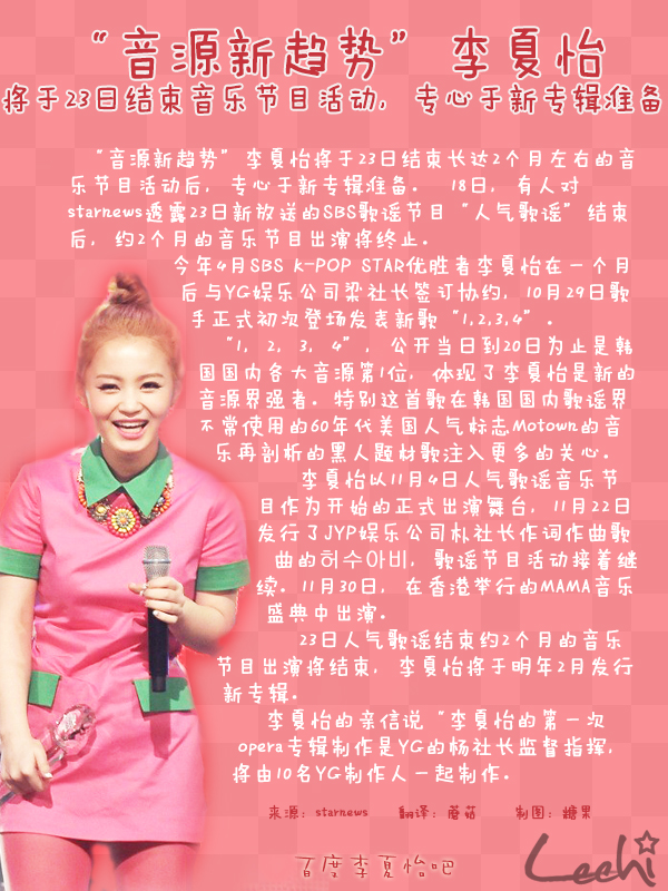 “音源新趋势”李夏怡将于23日结束长达2个月左右的音乐节目活动后,专心于新专辑准备。 18日,有人对starnews透露23日新放送的SBS歌谣节目“人气歌谣”结束后,约2个月的音乐节目出演将终止。