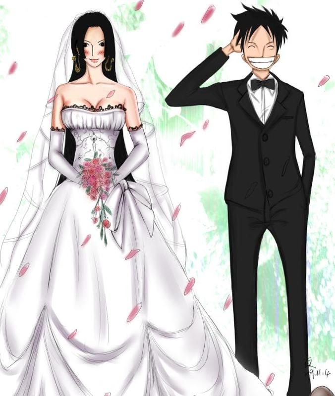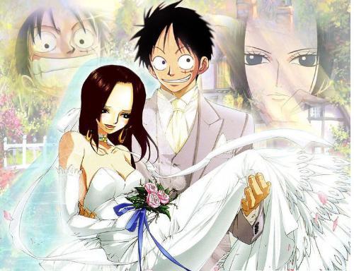 结婚那天,路飞满是笑脸的抱起汉库克,汉库克则小鸟依人般的躲在路飞怀里,九蛇岛上的人看着汉库克脸上羞答答的幸福表情,就知道当年汉库克的付出还有默默等待都是值得的