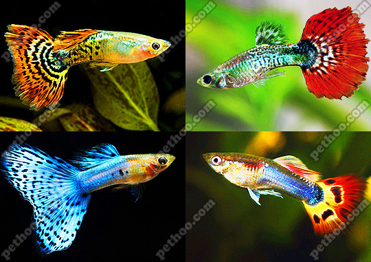 孔雀鱼常见品种有红袍孔雀、黑袍孔雀、蓝袍孔雀、蛇皮孔雀等。饲养水温18~24摄氏度,水质中性软水,饵料以鱼虫为主,也可摄食颗粒饲料。繁殖时雌鱼直接从体内分娩出仔鱼,每次产仔50~100尾,每月可产仔一次。