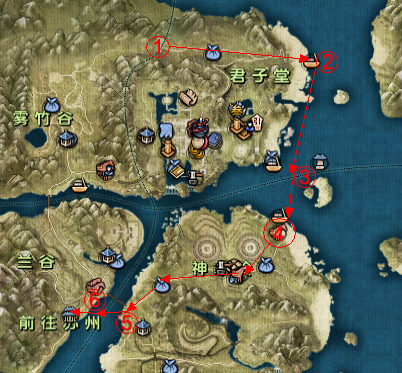 下面是我行军的路线图 1号点是我夺妹子书的地方 当时7.20 跑到2号点上船 在3号点下船往4号点游 然后再4号点坐马车点官驿落脚点 跑到5号点跳车 游到6号点神行风车转出去 7.29分15秒到的少林点藏书阁自动寻路 和妹子说的到少林了 然后九幽 离世 神行往上冲 到藏书阁台子哪儿卡了几秒 然后交书发现包没书了。。