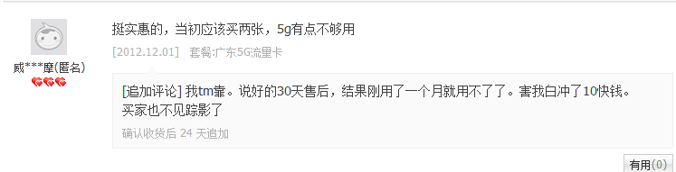 说好的月租8元5g流量。结果刚刚用了一个月就用不了了。买家也联系不上了