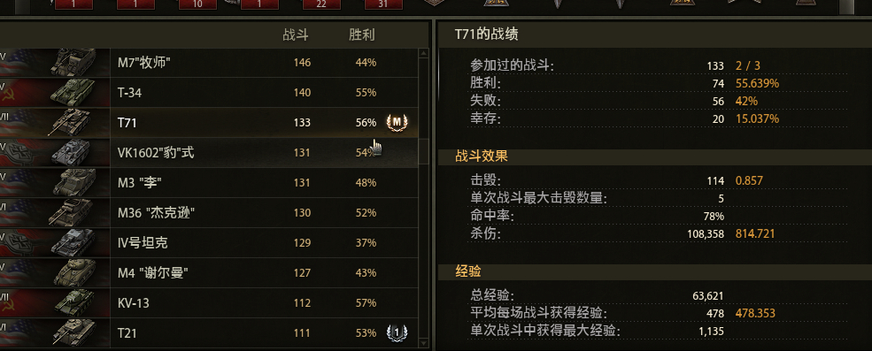 刚买了T71昨天打了一盘无V单倍纯经验1400,才2级勋章。