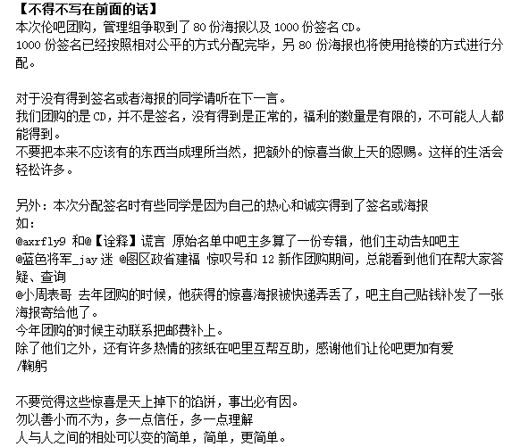 我的建议,如果年年都是老吧友或活跃吧友得到签名福利,总该要有一部份像抢楼这样分配签名福利吧,这样大家团购时才有盼头和更大的惊喜,希望下次能够更改下分配签名福利的方式。这次我也本没有抱希望得到签名,查了,果真在抢楼里。