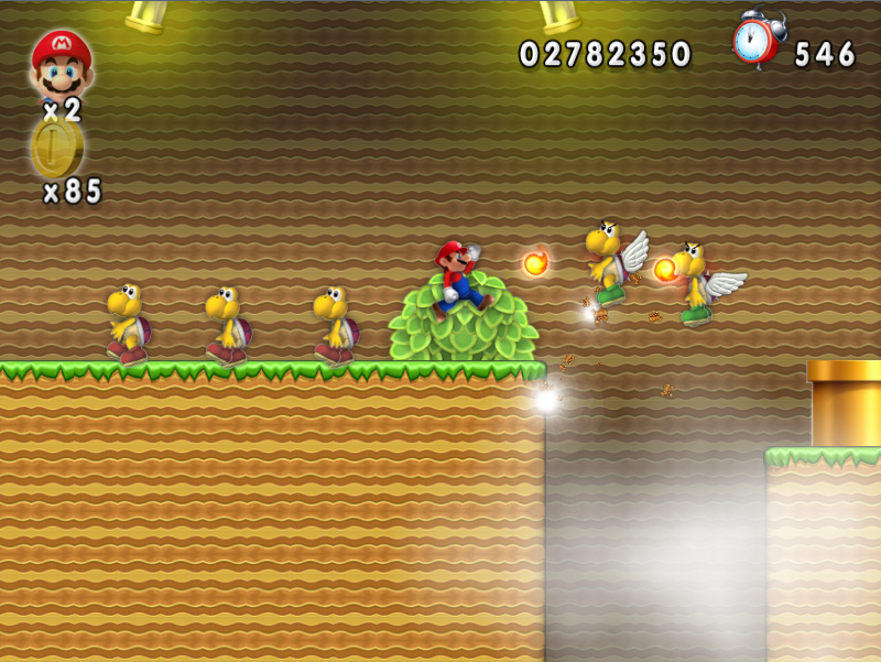 这一段路的难度还算比较平行,本关的主要场景是各种乌龟的聚会。绿乌龟、红乌龟、锤子龟、飞乌龟、飞锤子龟、飞火球龟,种类还真是够多的。前面出现了比较多的“隐藏墙”,这个设计和