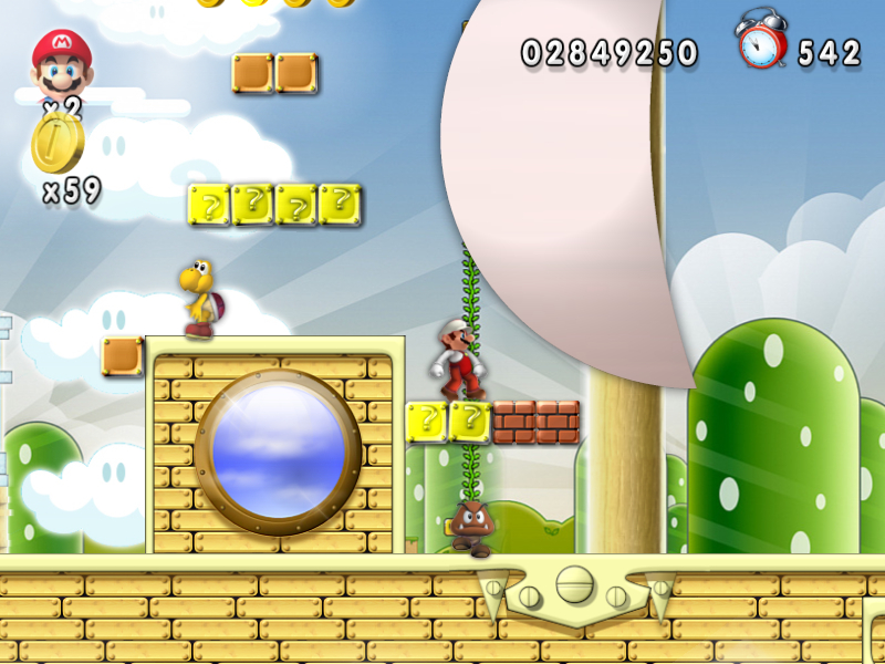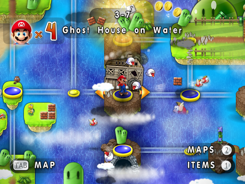 第一个场景难点不在骨头龟,也不在大摆球,而是在场景末尾的兽面锤(石盾)。由于兽面锤比较高,且马里奥是从下面踢墙跳或者“飞檐走壁”上来的,因此不清楚地形的话很容易跑过头然后被暗算。另外鬼屋里看着位置不靠谱的门就别进了,八成是好心地送你回起点……所以好奇心请不要那么强烈。
