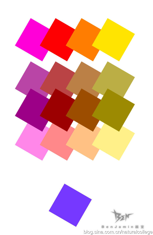 第一步,用色环上邻近的颜色来起稿,这符合色彩的和谐美。在继续深入的过程中也要尽可能采取用邻近色画画,等到你画到后来可能才会往里面加入比较冲突的颜色,就是色环上面对面的颜色。一般叫做对比色或者互补色。我们使用了从红到黄这样一组邻近色来画我们的英雄联盟的女英雄们。大家都知道我的色彩不是那么写实,色彩特别强烈,所以特别重要的是,这些色彩虽然强烈,但都是在色环上比较邻近的颜色,这样大家容易接受点,如果色彩这么饱和,又是色环里面离的非常远的颜色那就非常非常危险,一般人会接受不了,会引出恶心、憎恶、讨厌等等不良的情感。