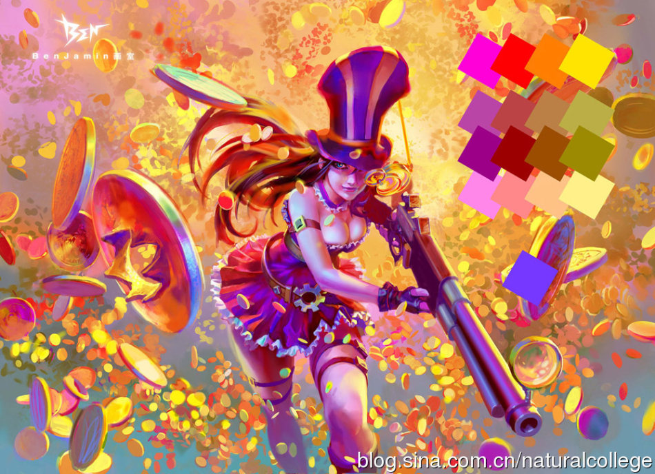 这是一次为电脑网络游戏<英雄联盟>所创作商业插画的工作。我热爱游戏世界的女英雄们,在开始画英雄联盟的女警之前,先和大家分享插画艺术的小知识。画色彩插画,无论多么绚烂的颜色,都要从一个颜色开始,逐渐增加,而要成为我这样的画家,也像从一个颜色开始画画一样,一点也不难,只要先成为比现在的自己好一点的画家。然后每天好一点,每个月画的更好一点,指日可待。
